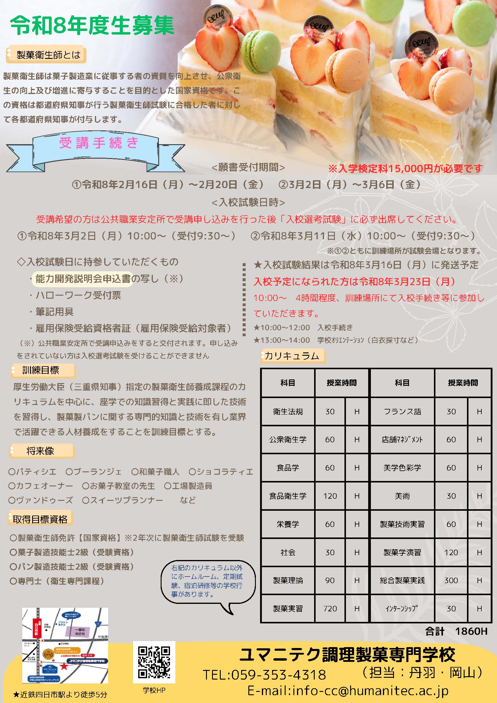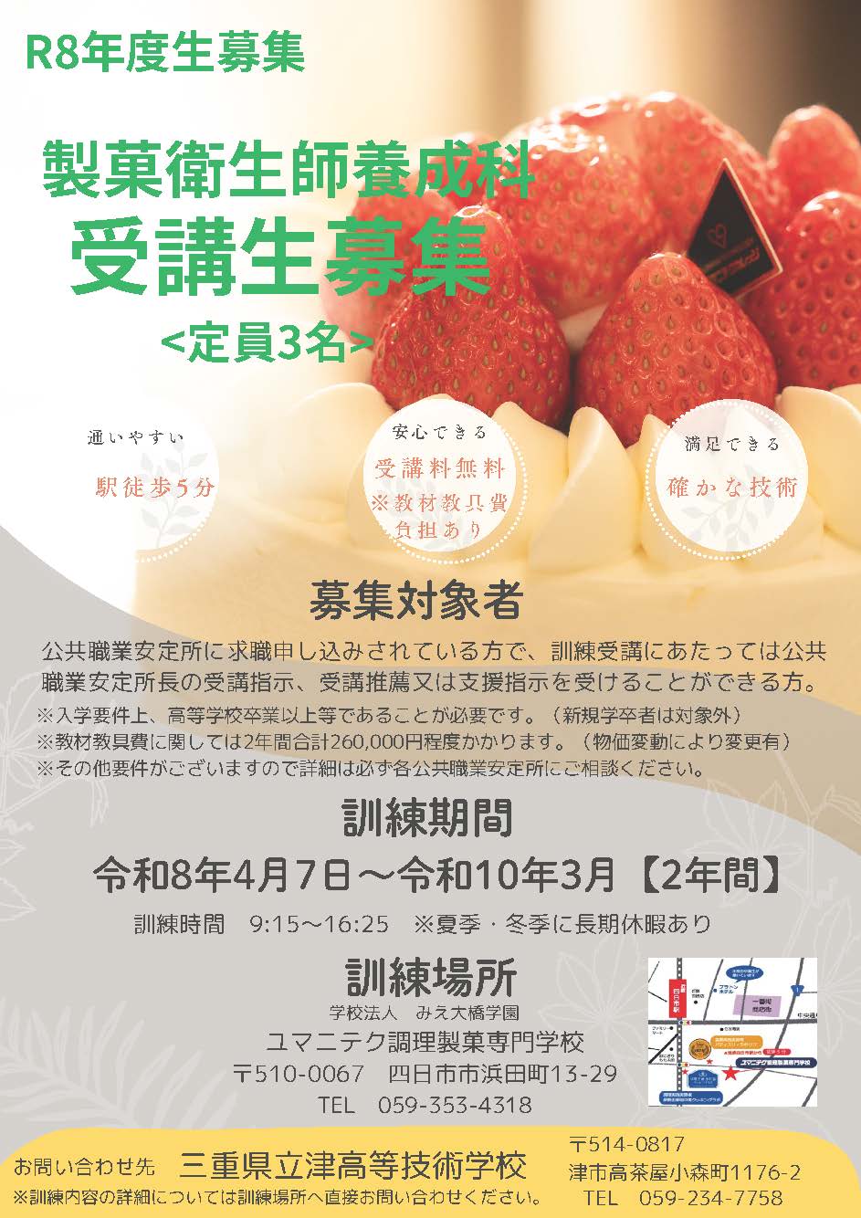 今年度も製菓衛生師養成科での三重県委託訓練コースの募集を行うこととなりました!