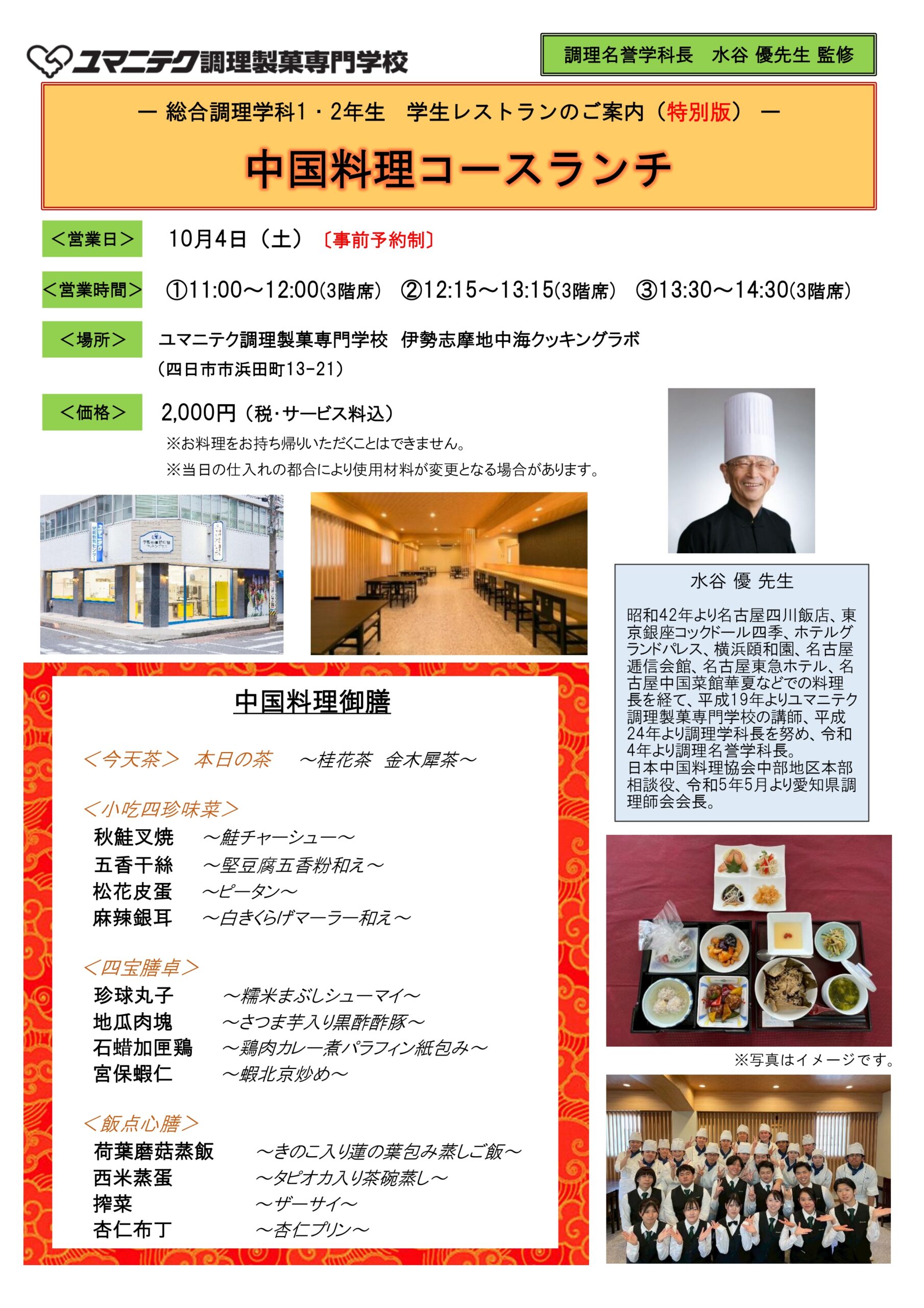 10月4日(土)の学生レストラン(中国料理)へご予約のお客様へ