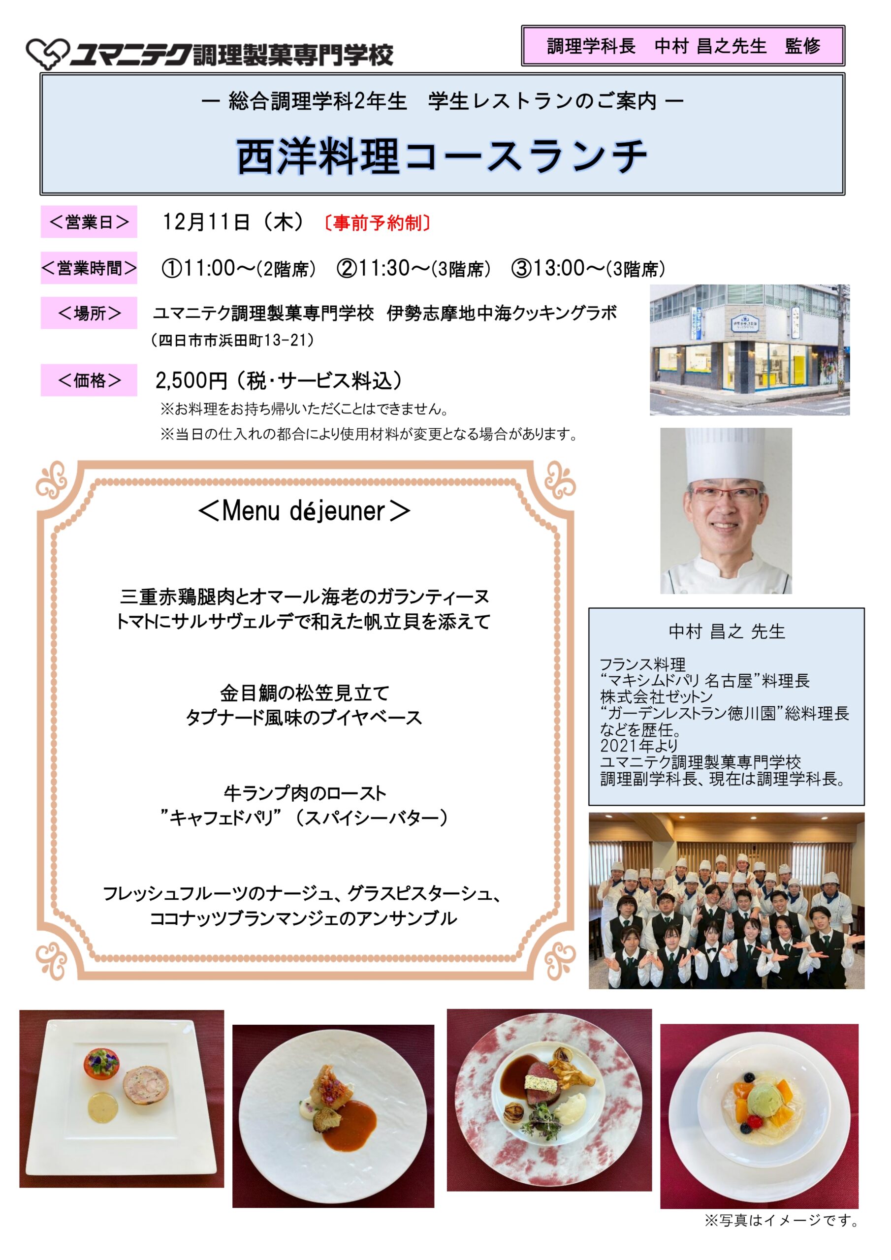 12月11日(木)「西洋料理コースランチ」料金2,500円(税込)