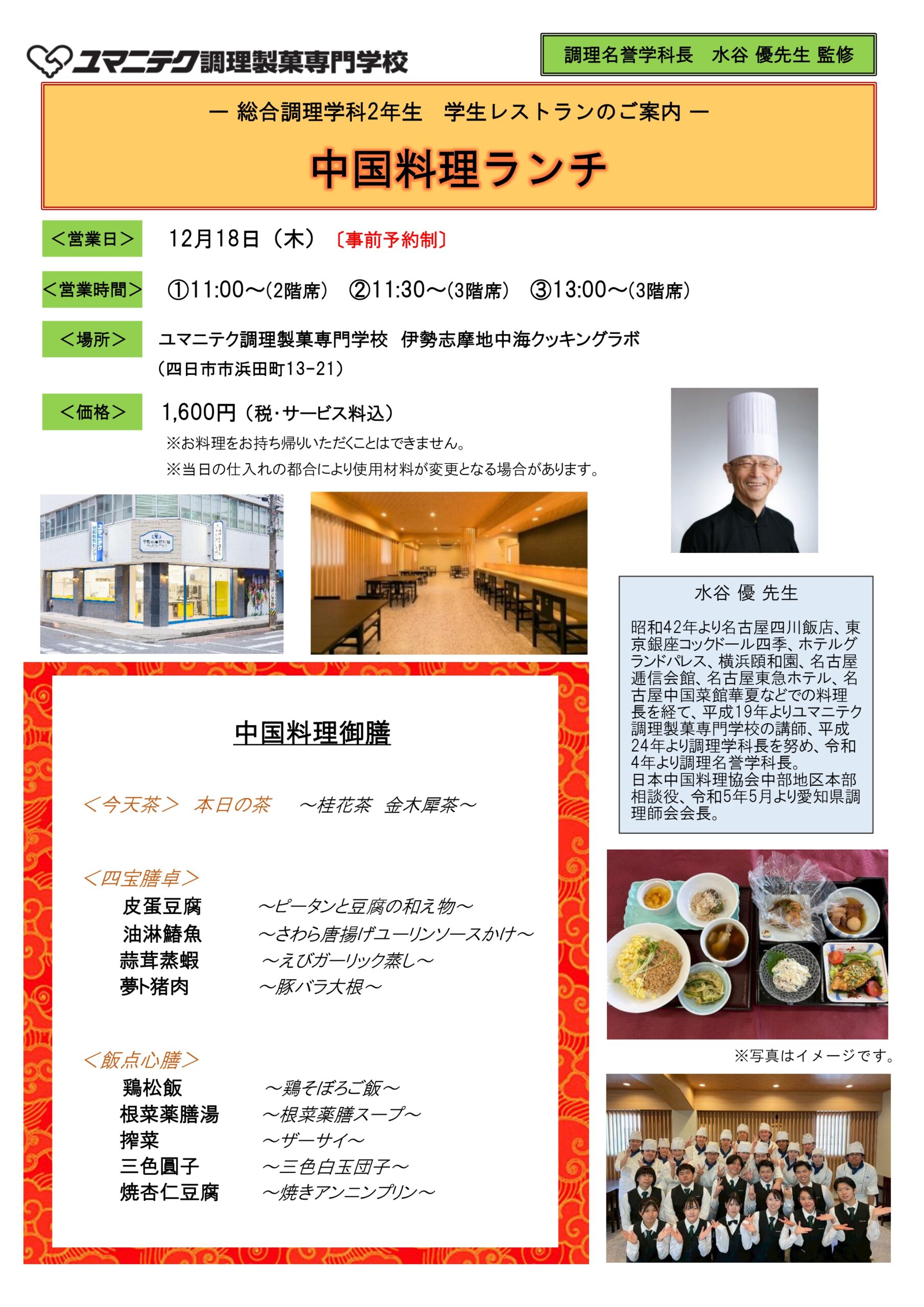 12月18日(木)「中国料理ランチ」料金1,600円(税込)